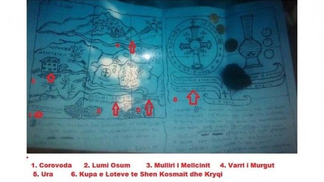 Harta tregon vendin ku ishte fshehur “Kupa e Lotëve”, skicën dhe inventarin e saj të shoqëruar dhe me një përshkrim të hollësishëm poshtë saj.