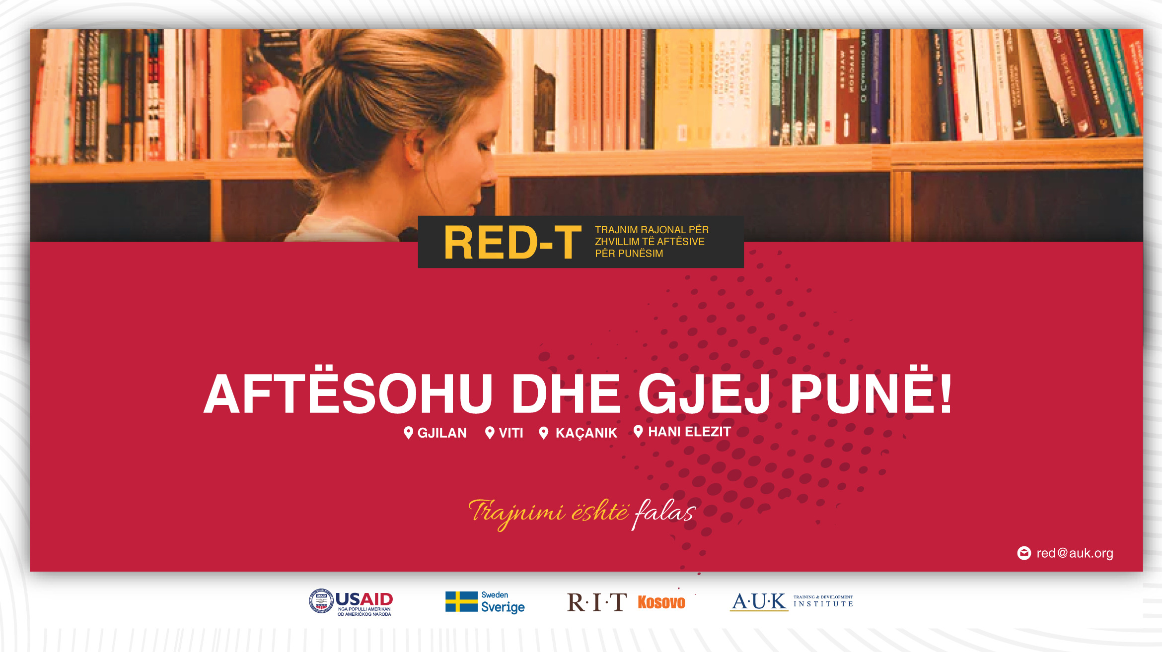 RIT Kosovo (A.U.K) ka filluar implementimin e projektit “Trajnimi Rajonal për Zhvillimin e Aftësive për Punësim” (RED-T). Projekti RED-T financohet nga USAID Empower Private Sector Kosovë në partneritet me Sida - Styrelsen för Internationellt Utvecklingssamarbete.