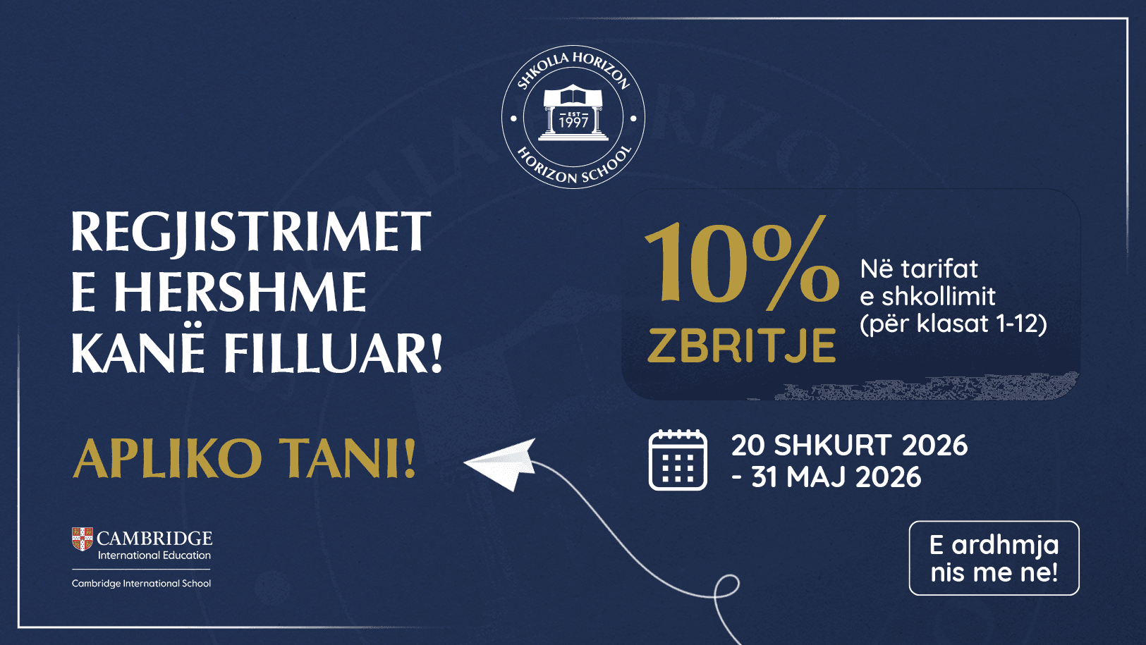 Horizon School ka hapur zyrtarisht regjistrimet e hershme për vitin shkollor 2026. Periudha e aplikimit është e hapur nga 20 Shkurti deri më 31 Maj 2026, për të gjithë prindërit që dëshirojnë t’u sigurojnë fëmijëve të tyre një arsimim cilësor dhe të certifikuar sipas standardeve ndërkombëtare.