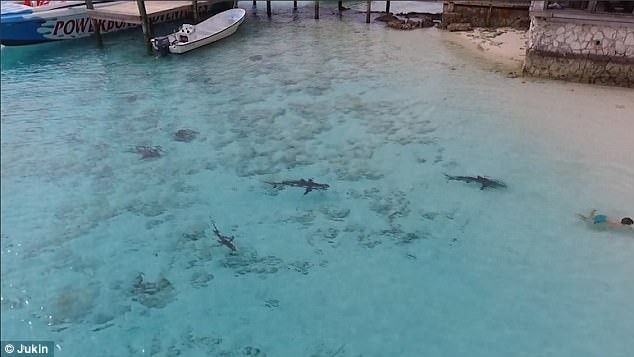 Pamjet e marra nga droni në një bregdet në Bahame, shfaqin një fëmijë teksa hynte në ujë, pa ditur se aty ishin katër peshkaqenë.