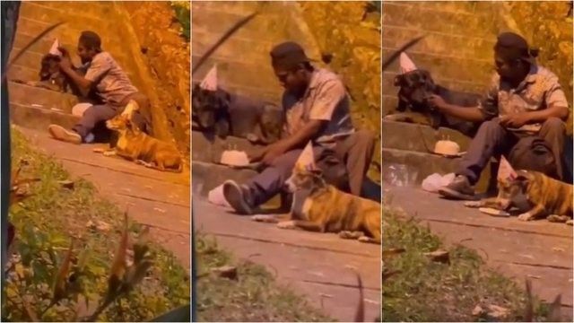Në një video të shpërndarë në mediat sociale, tregohet burri duke ua vendosur nga një kapele feste dy qenve dhe duke i përkëdhelur.