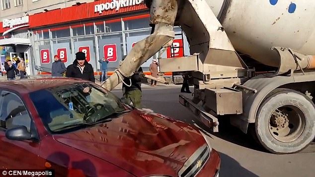 Ai kishte vendosur t'ia mbush veturën me beton, pasi që e dinte se vetura ishte pika e saj e dobët. Ndërsa, ky incident bizar është filmuar me telefona të mençur nga kalimtarët e rastit në Shën Petersburg të Rusisë.