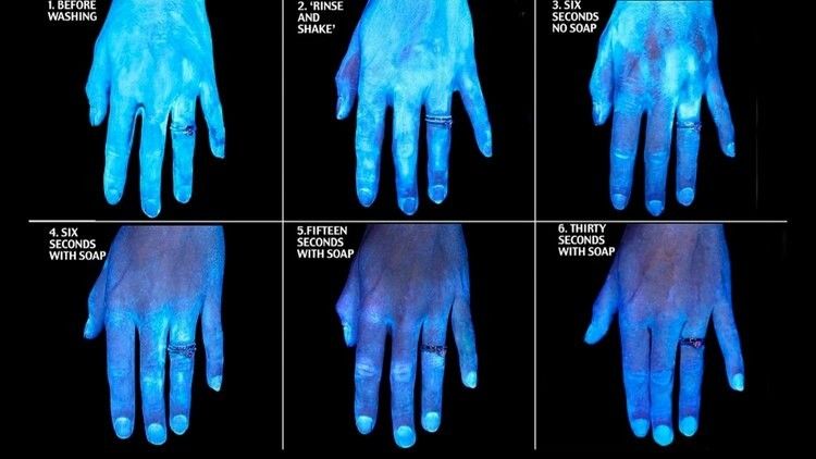Në imazhin e ekspozuar ndaj dritës ultravjollcë, tregohet një rend i fotografive të duarve në të cilat mund të shihni ndryshimin midis larjes së duarve me ujë, me ujë dhe sapun, ose me ujë dhe sapun për gjashtë, pesëmbëdhjetë ose tridhjetë sekonda, transmeton Telegrafi.