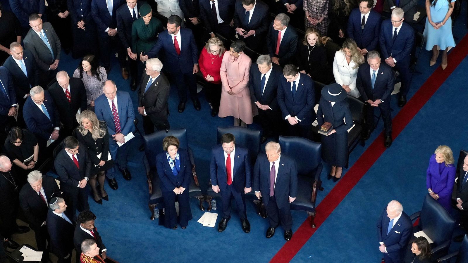 Ai u dorëzua drejt gruas së tij Melania, të cilën u përpoq ta puthte në mënyrë të sikletshme dhe përshëndeti paraardhësin e tij, Joe Biden, i cili po qëndronte përballë familjes Trump me ish-zëvendëspresidenten Kamala Harris pranë tij.