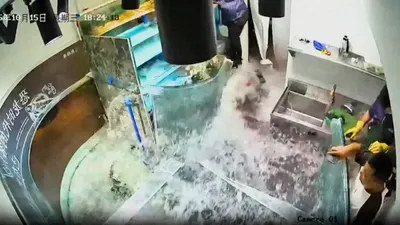 Akuariumi gjigant i peshqve të një restoranti kinez u thye papritur javën e kaluar, duke e përmbytur plotësisht dhomën e ngrënies me dhjetëra peshq të gjallë.