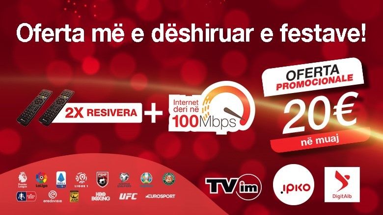 Duke vazhduar te ofrojë shërbime superiore të kombinuara (TV + internet), këtë herë IPKO ofron për klientët e rinj 2 resiver me një çmim promocional: një resiver ku përfshihen edhe të gjitha kanalet e sportit si dhe resiverin e dytë me 100 kanale! Për më tepër, me këtë ofertë klientët përfitojnë edhe internet me shpejtësi deri në 100 Mbps.