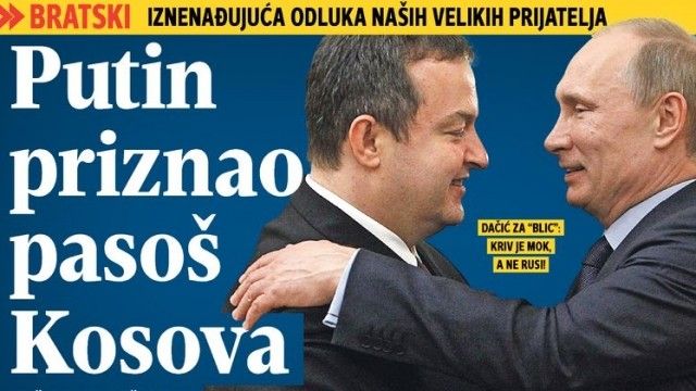 “Putin pranon pasaportën e Kosovës”, është titulli kryesor, derisa në mbititull ka të shkruar: “Vëllazërisht - Vendim i befasishëm i miqve tanë të mëdhenj”.