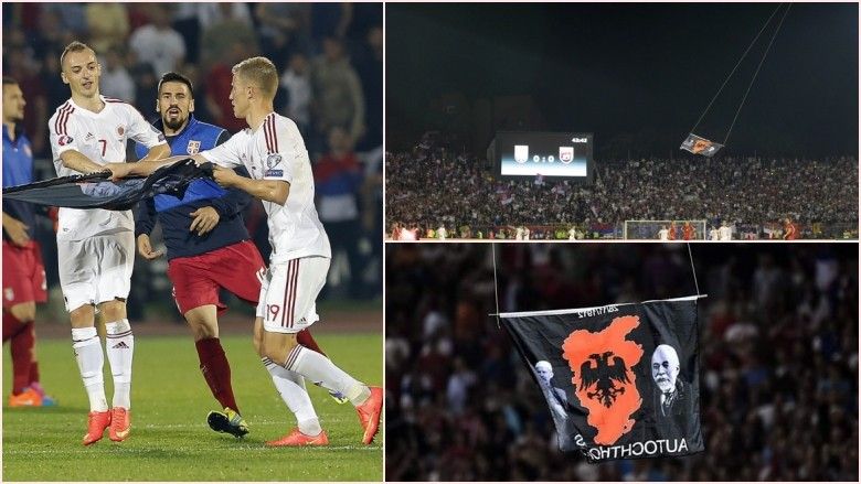 Ndeshja ishte ndërprerë, pasi një dron me flamurin e "Shqipërisë Etnike" me “Autochthonous” dhe dy figurat e shquara kombëtare, Ismal Qemalit dhe Isa Boletinit, u fut në stadium që i parapriu incidentit.