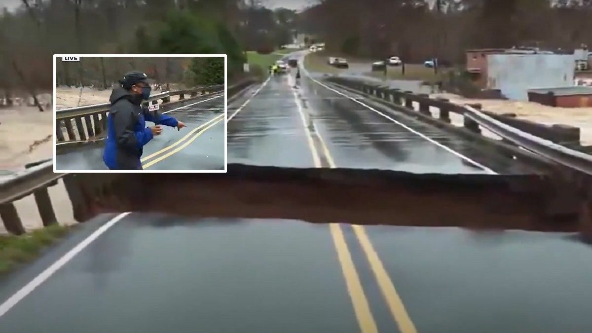 Një reportere e cila ishte në transmetim të drejtpërdrejtë në Karolinën e Veriut, shpëton për një “fije floku” pasi shembet ura vetëm disa metra larg saj, për shkak të reshjeve të mëdha.
