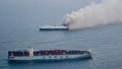 Ishte nisur nga Kina, anija me 3,000 makina të reja fundoset në Paqësor pas zjarrit shkatërrues