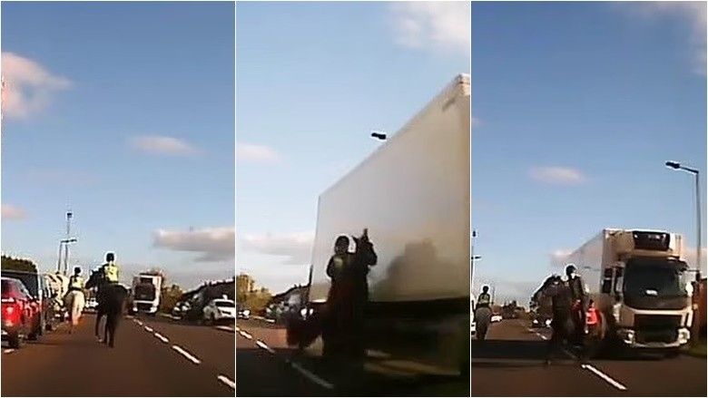 Pamjet tregojnë kalin duke u trembur dhe duke u përpjekur të largohet nga kamioni, por në panik, në një ngjarje të ndodhur afër Barnsley.