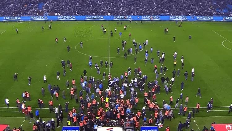 Futbollistët e Fenerbahces festuan fitoren në mesin e fushën, por kjo nuk zgjati shumë, pasi që tifozët e Trabzonspor pushtuan fushën.