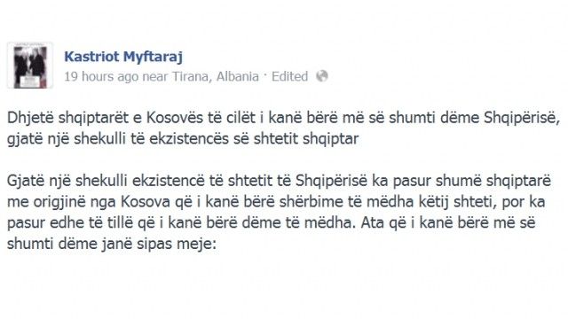 “Gjatë një shekulli ekzistencë të shtetit të Shqipërisë ka pasur shumë shqiptarë me origjinë nga Kosova që i kanë bërë shërbime të mëdha këtij shteti, por ka pasur edhe të tillë që i kanë bërë dëme të mëdha. Ata që i kanë bërë më së shumti dëme janë, sipas meje: