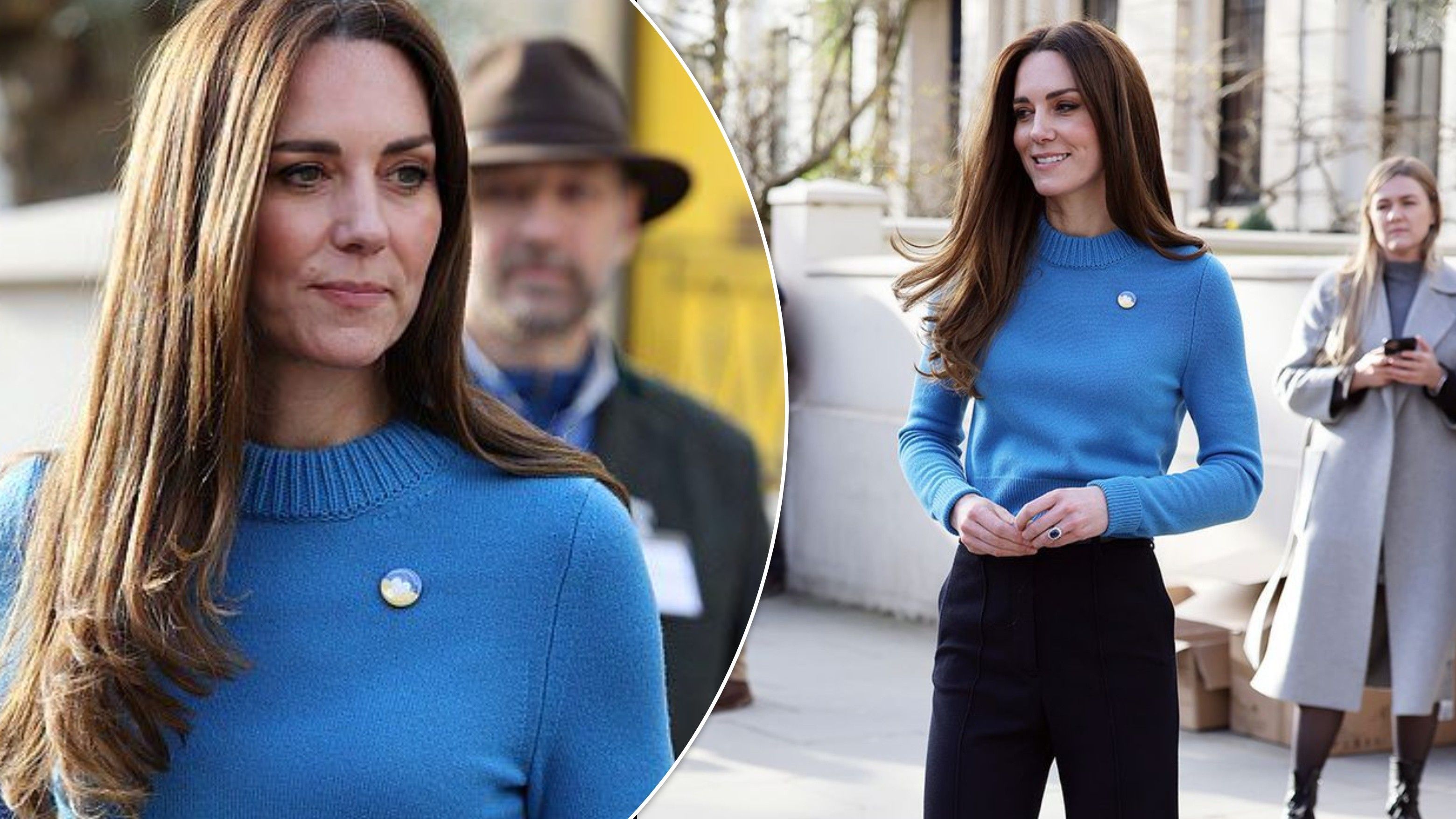 Kate Middleton mbështet Ukrainën e veshur me bluzën e kaltër nga Alexander McQueen dhe gjilpërën me flamur