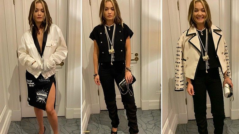 Për pamjen e saj të ardhshme, Rita veshi një xhaketë të bardhë me tubacione të zeza me një logo të ‘Chanel’ të qëndisur nëpër mëngë.