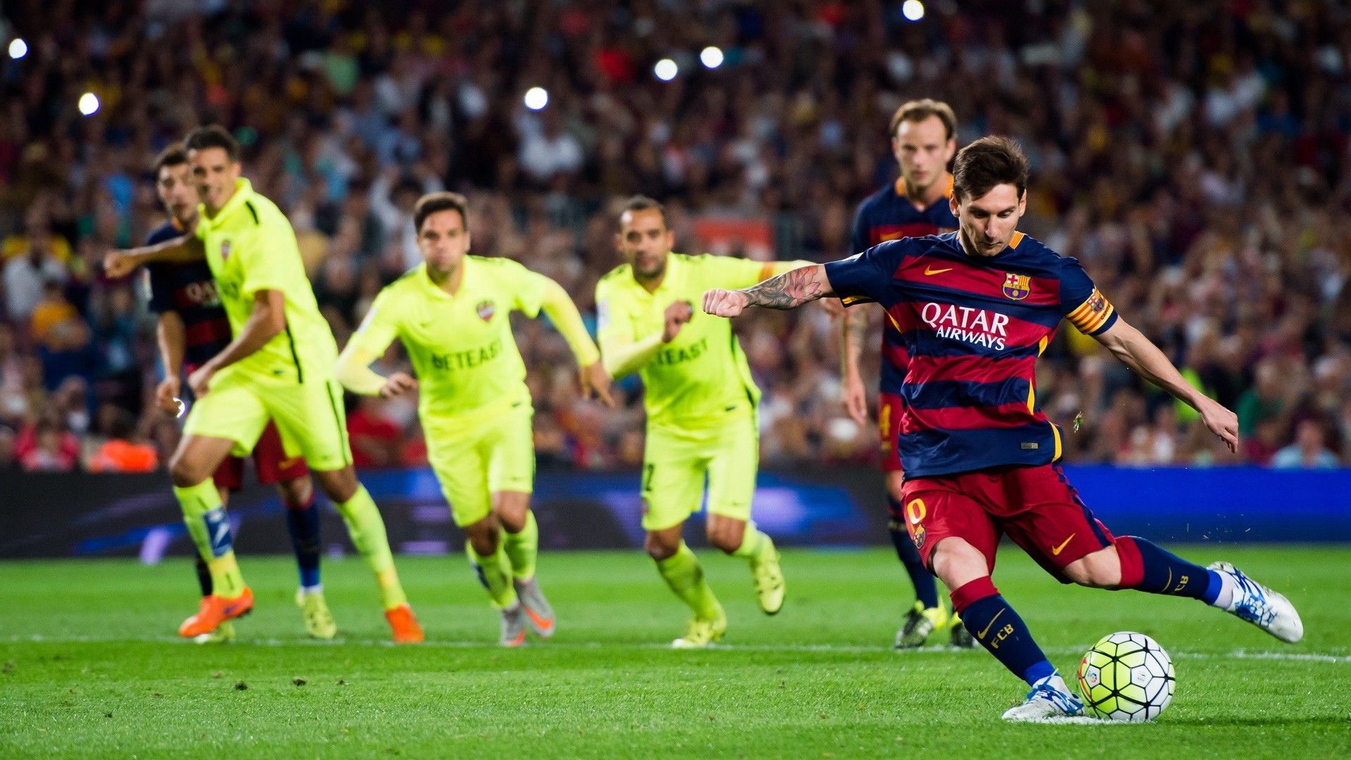 271:"BARCELONA, SPAIN - SEPTEMBER 20: Lionel Messi of FC Barcelona kicks a penalty shot and scores his team's third goal during the La Liga match between FC Barcelona and Levante UD at Camp Nou on September 20, 2015 in Barcelona, Spain. (Photo by Alex Caparros/Getty Images)