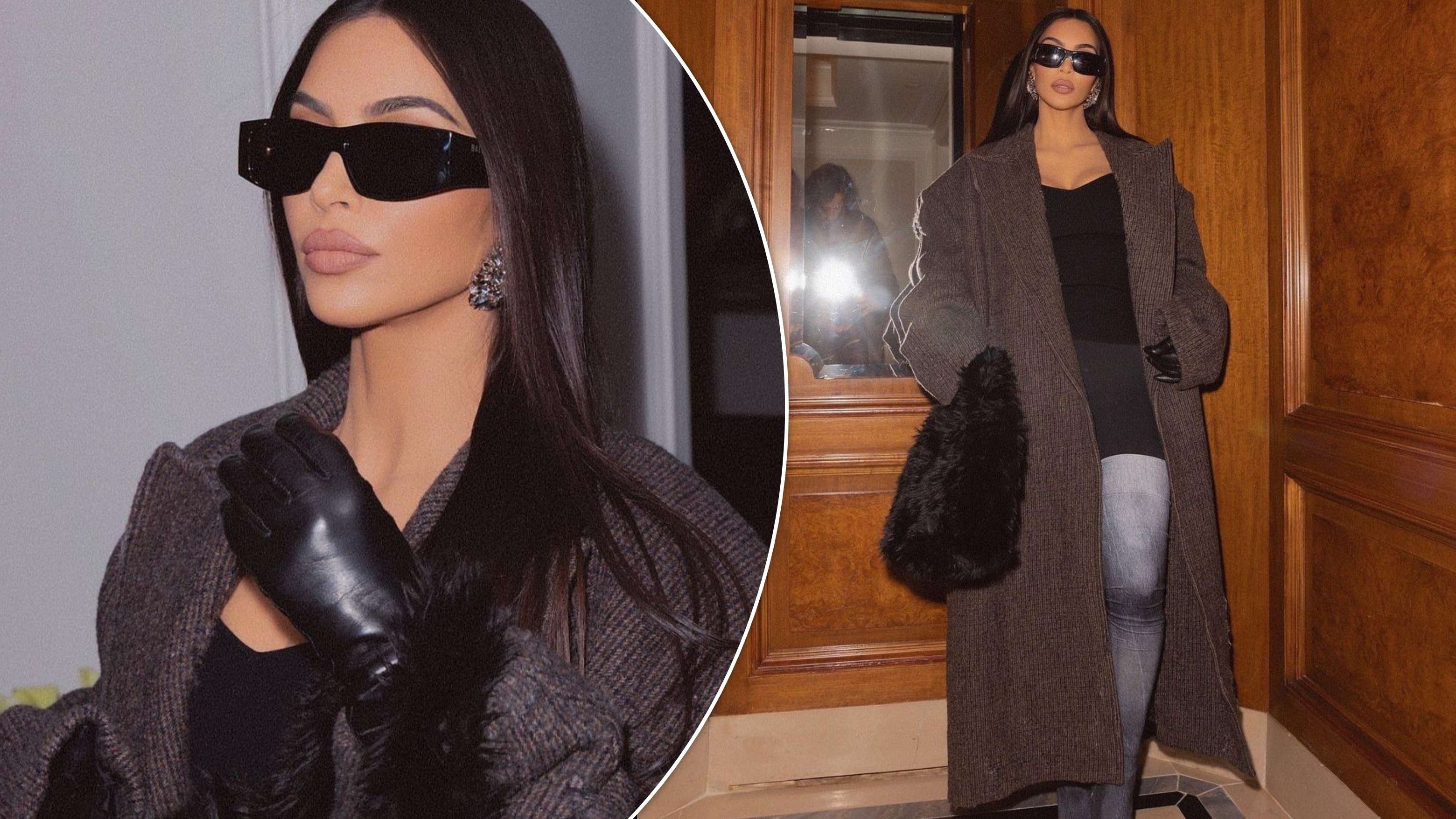 Duke mbështjellë gjërat e saj në hollin e një hoteli, Kim e përfundoi pamjen me një pallto dimërore të madhe, syze dielli në stilin Y2K, një çantë të zezë me lesh, doreza lëkure dhe vathë të mëdhenj diamanti.