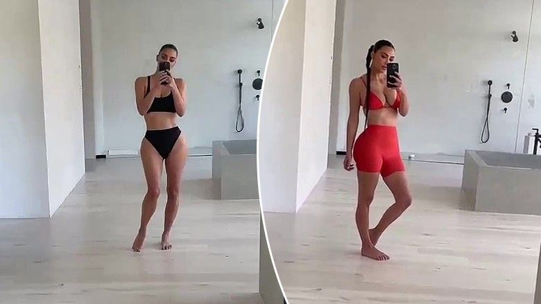 Pasi u shfaq me të brendshme në të zeza, Kim provoi edhe një palë të kuqe, duke vënë sërish në pah hiret e saj të trupit.