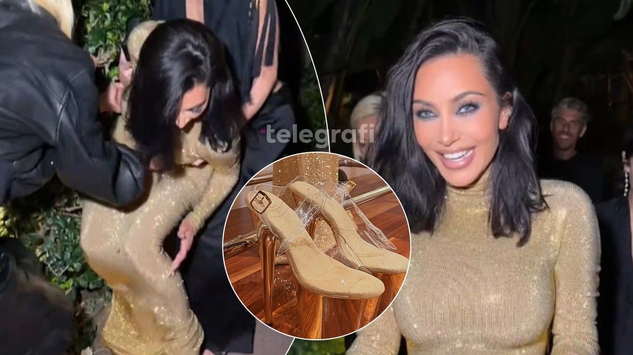 Kim Kardashian rrëzohet me taka të larta rrugës për në festën e Vanity Fair Oscars