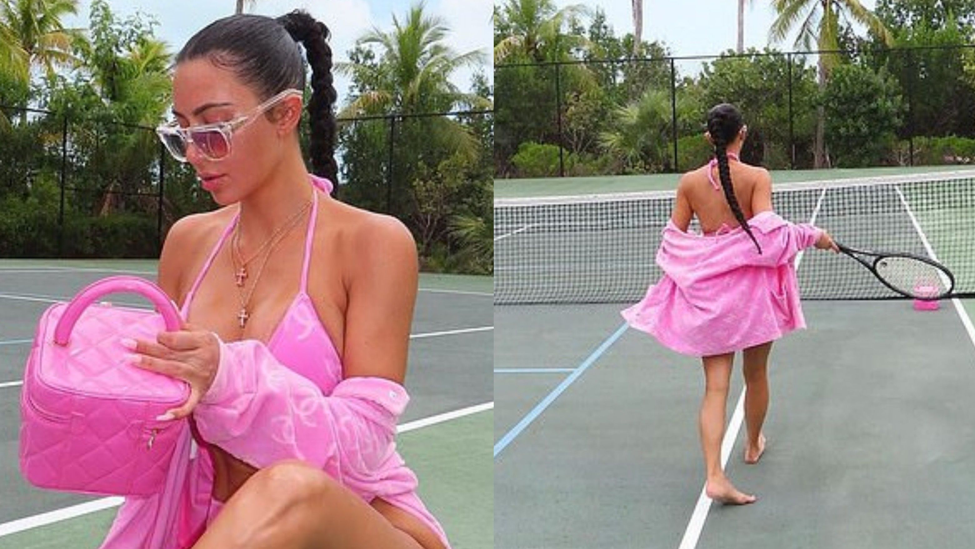 Foto u realizuan në një fushë tenisi teksa ylli televiziv shihet e zbathur dhe me një xhaketë dhe çantë rozë të kombinuara me rroba banjë.
