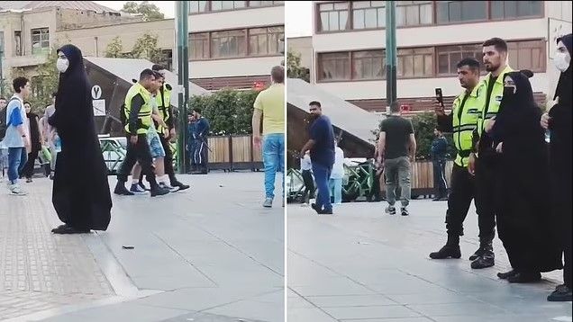 Një video amatore shfaq momentin kur policia iraniane e moralit, arreston një burrë që kishte veshur bluzë me mëngë të shkurtra dhe po shëtitej nëpër qytet.