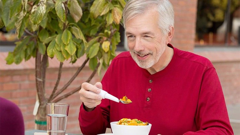 Fjala është për aparatin i cili punon me bateri, me dorëzën e cila anulon dridhjen e duarve dhe pengon që ushqimi të derdhet apo pacienti të lëndojë fytyrën.