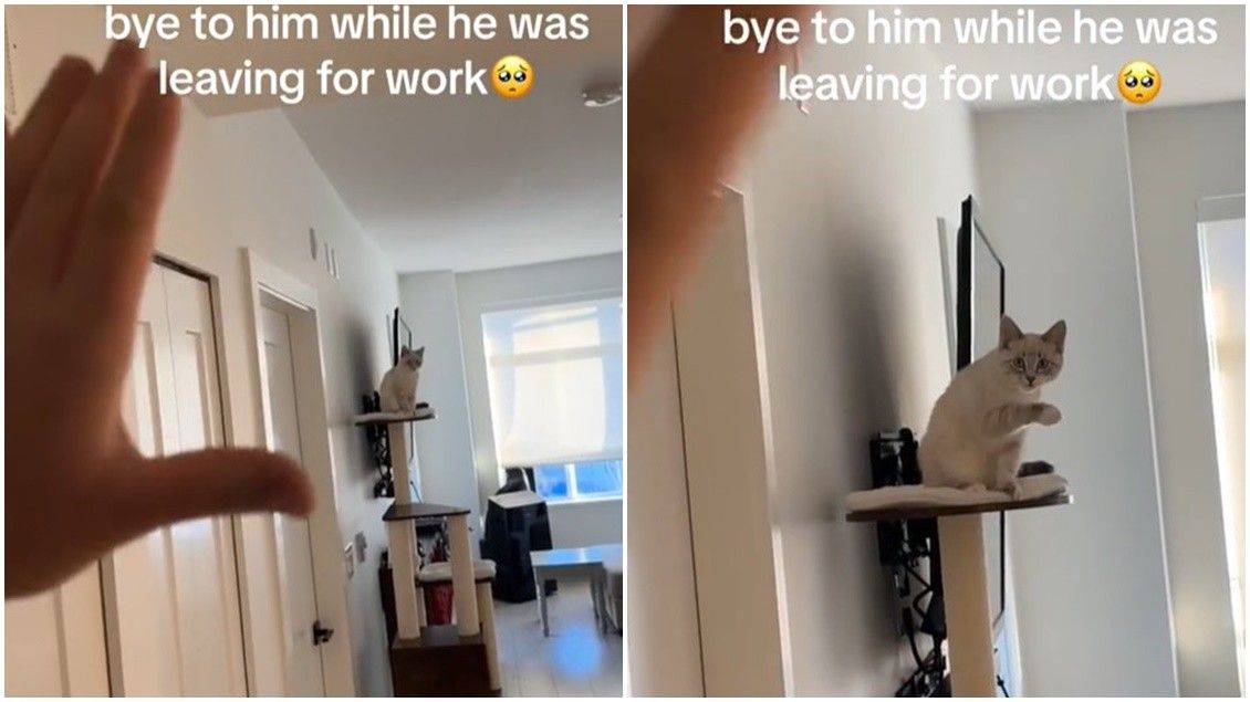 Macja po qëndronte mbi komodinë dhe një burrë i cili po shkonte për në punë vendosi ta xhironte si dhe ta përshëndeste me dorë, si për çudi edhe macja ia ktheu përshëndetjen në të njëjtën mënyrë, transmeton Telegrafi.