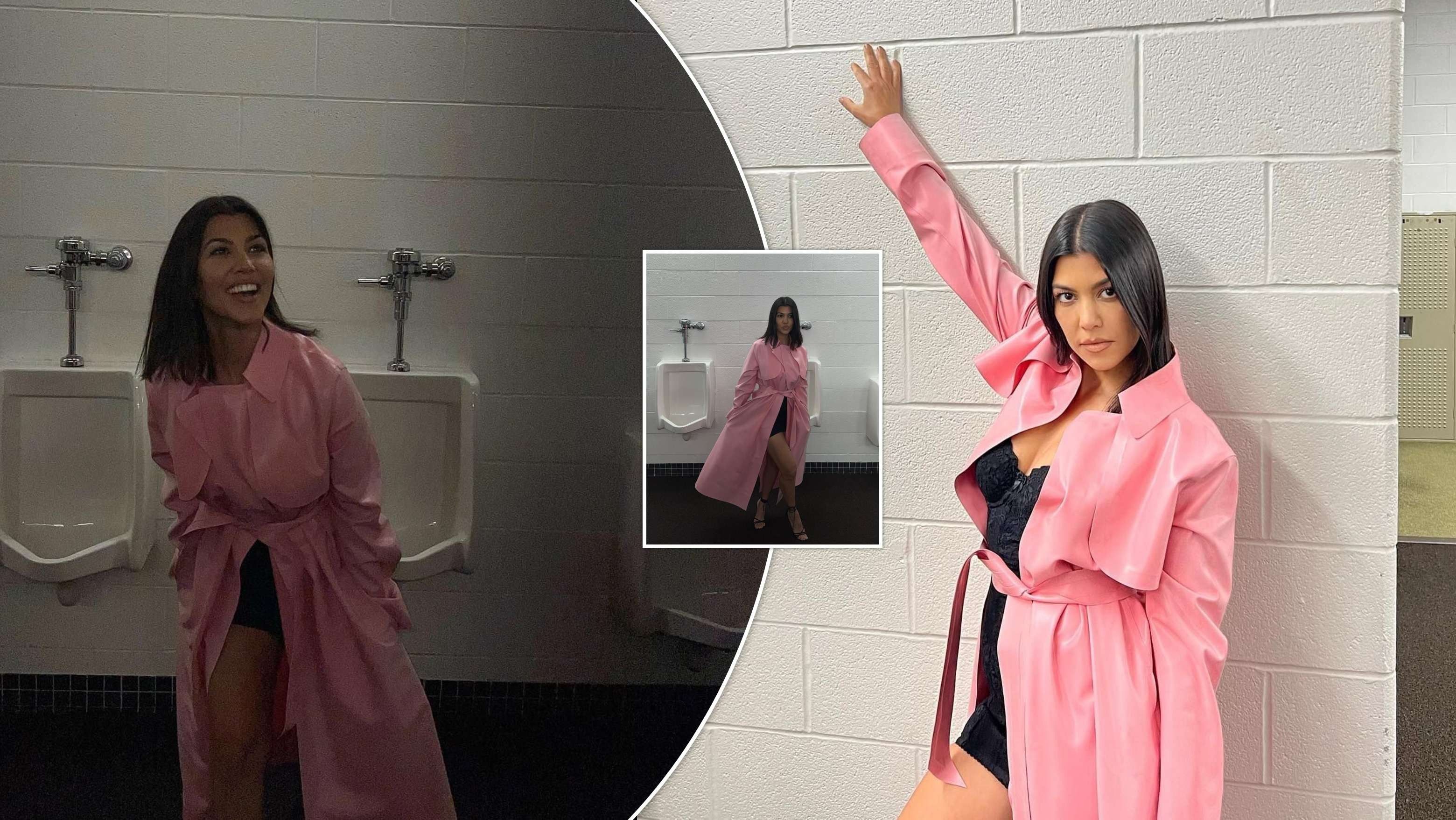 Kourtney Kardashian modelon pallto lëkure në banjën e meshkujve