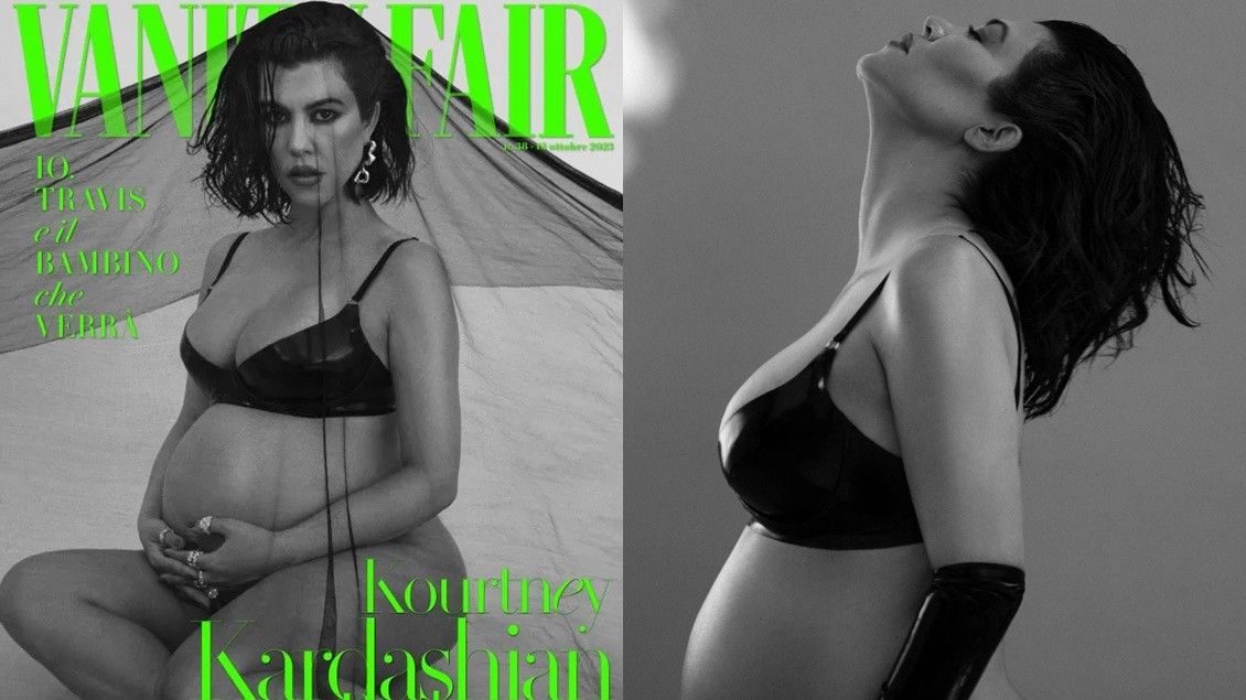 Ylli televiziv Kourtney Kardashian ka shfaqur barkun e saj të shtatzënisë në vetëm një set sytjenash lëkure dhe të brendshme për realizimin e kopertinës dixhitale të tetorit “Vanity Fair Italy”.