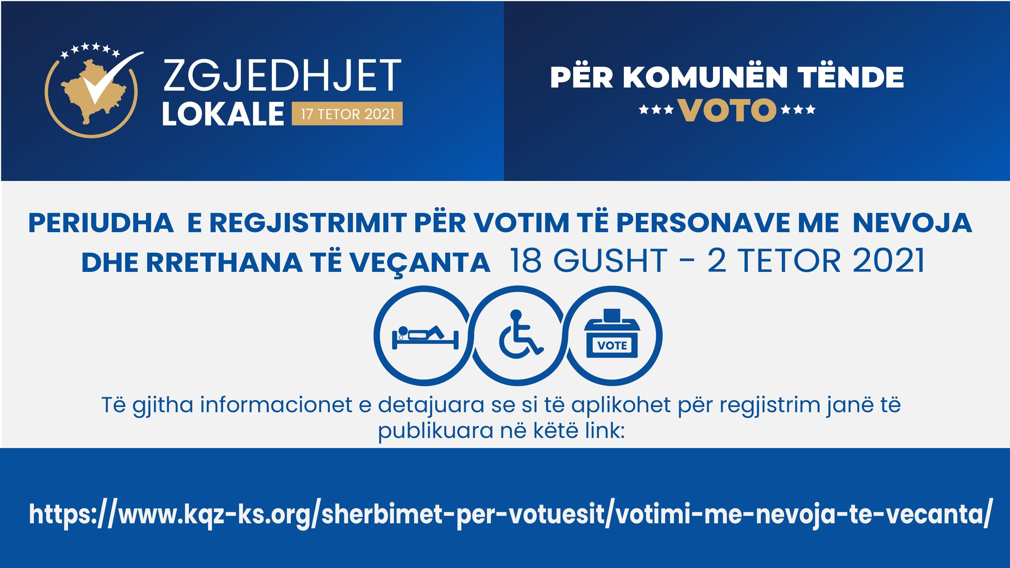 Aplikacionit për regjistrim ju duhet t’i bashkëngjitni një kopje të dokumentit të identifikimit dhe të certifikatës së aftësisë së kufizuar, të diagnozës mjekësore, dhe dëshmitë për rastet të tjera të veçanta, të cilat duhet të dorëzohen në zyrën e Komisionit Komunal të Zgjedhjeve, më së voni deri më 2 tetor 2021.