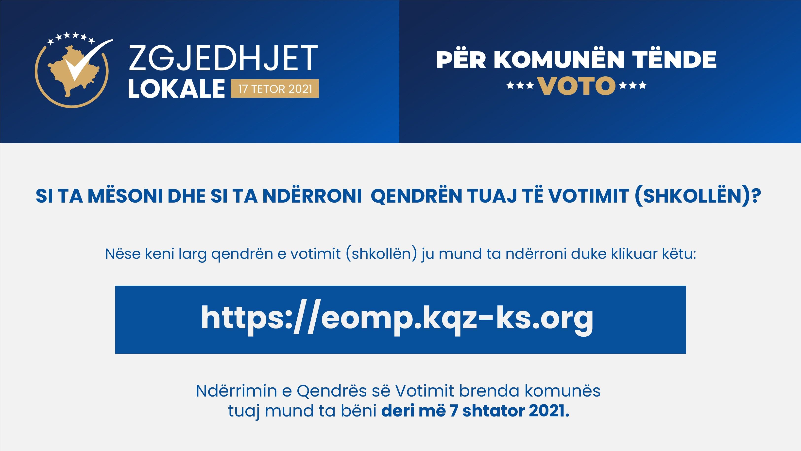 Qendrën tuaj të votimit mund ta mësoni dhe ta ndërroni përmes aplikacionit online që është vendosur në ueb faqen e KQZ-së: www.kqz-ks.org duke klikuar në linkun “Gjejë dhe ndërro Qendrën e Votimit” apo duke vizituar zyrën e Komisionit Komunal të Zgjedhjeve në komunën tuaj.