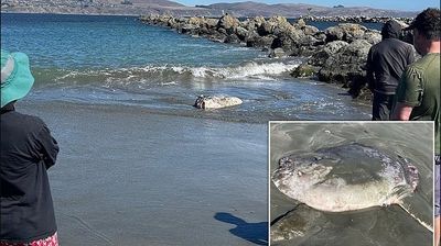 Një peshk ‘dielli’ gjigant dhe jashtëzakonisht i rrallë është shfaqur në një plazh të Kalifornisë - duke mahnitur vizitorët herët në mëngjes të cilët hasën rastësisht krijesën e çuditshme dy metra të gjatë.