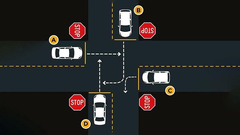 Kur dy automjete mbërrijnë në një kryqëzim në të njëjtën kohë, përballë njëri-tjetrit dhe duke planifikuar të kthehen në të njëjtin drejtim, automjeti që kthehet djathtas ka përparësi. Po sikur të katër makinat të mbërrijnë në kryqëzim në të njëjtën kohë?