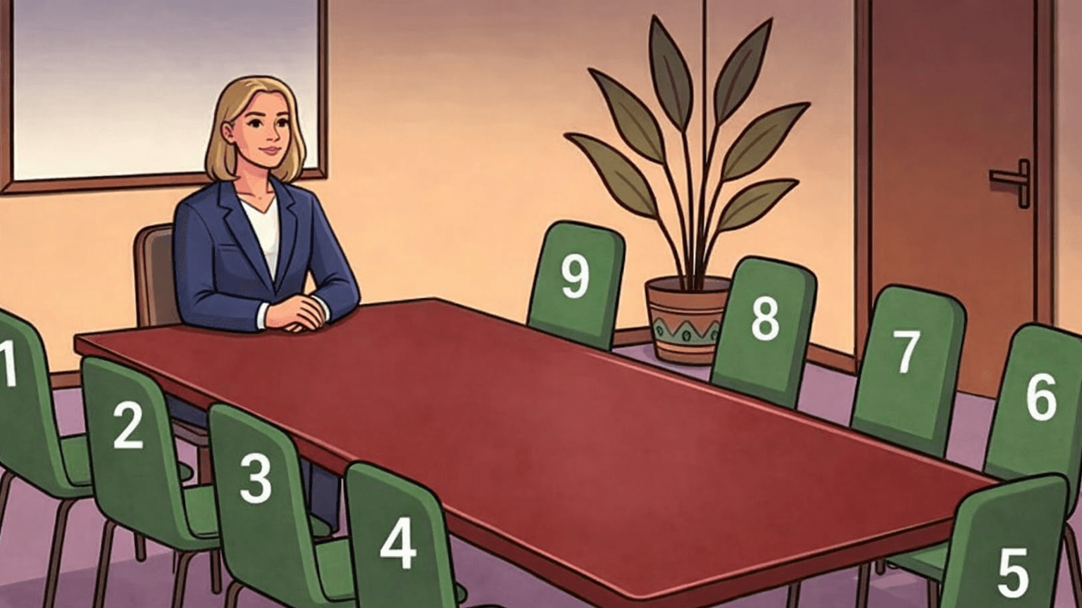 Paramendoni se hyni në një takim me shefin dhe ekipin. Shikoni tavolinën dhe zgjidhni vendin pa menduar shumë. Cilën karrige zgjidhni?