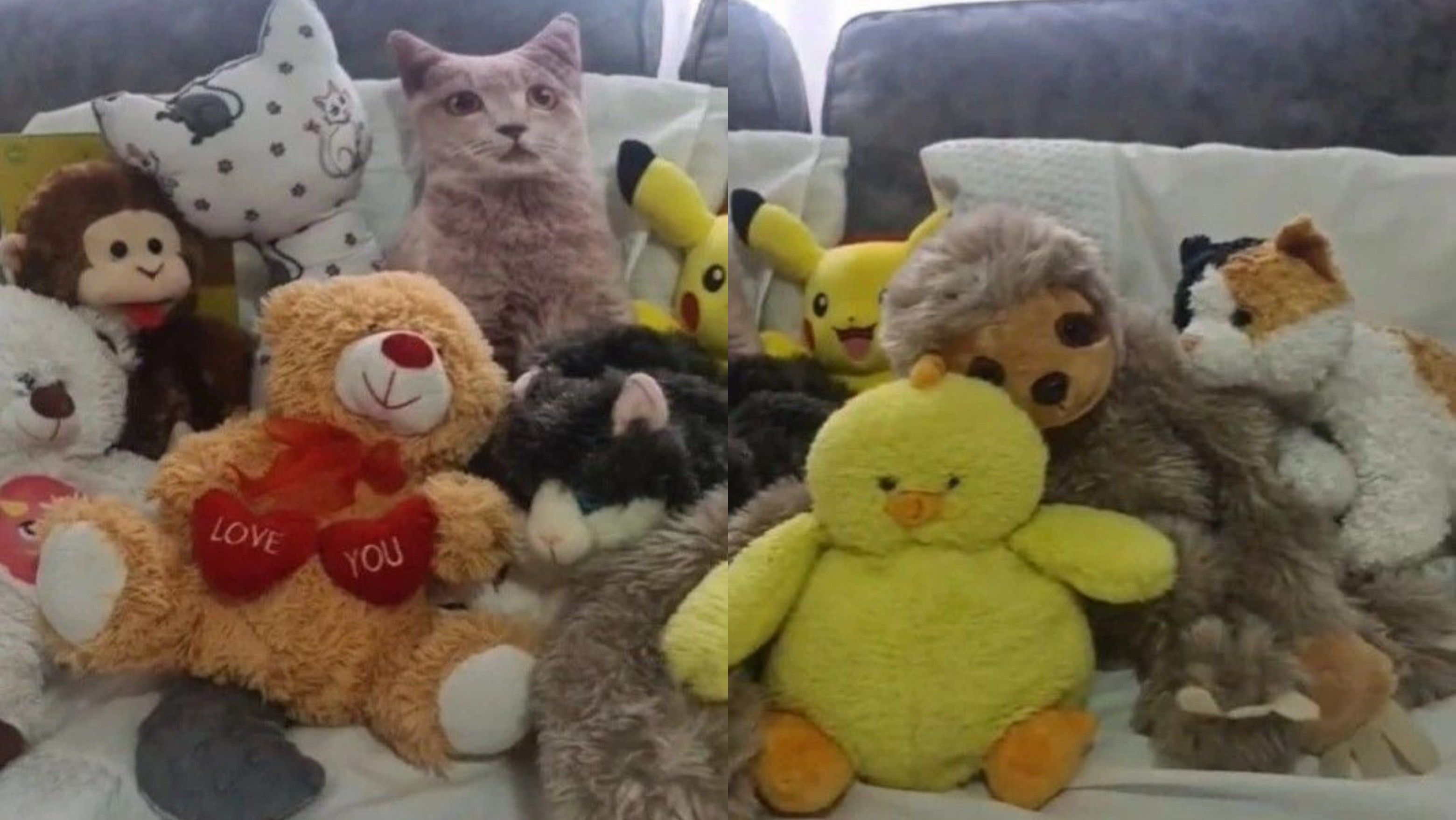 Kafshët e mbushura përfshinin disa mace lodër, por macja e vërtetë mezi shihet në grumbull. Nëse jeni duke qëruar sytë duke kërkuar për macen e poshtër, shikoni nga afër në fund të videos.