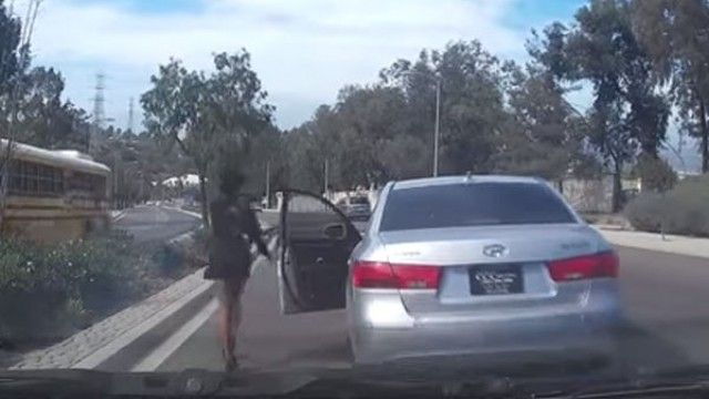 Nuk dihet se cili mund të ketë qenë motivi që e ka shtyrë një femër vozitëse që përnjëherë të frenojë dhe të dalë nga vetura, transmeton Telegrafi.