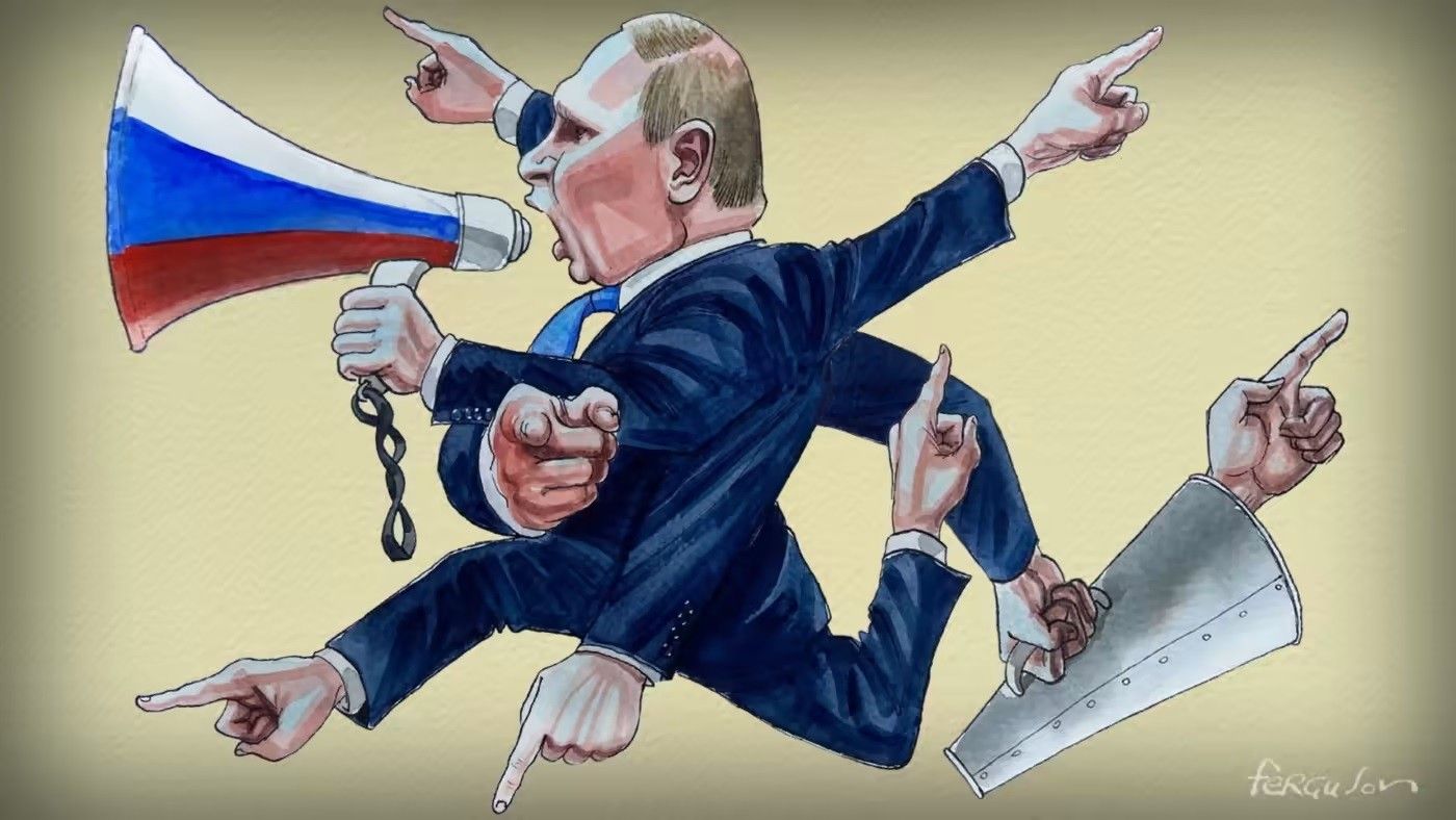 Fjalimi i tij i javës së kaluar, duke njoftuar aneksimin e paligjshëm të pjesëve të Ukrainës, ishte përplot i mbushur me mendime konspirative. Sipas Putinit, Perëndimi në përgjithësi nuk “do që të jemi të lirë; ata duan të jemi koloni ... Duan të na vjedhin”. Në rastet e mëparshme, Putini dhe këshilltarët e tij kryesorë janë referuar te teoria e konspiracionit e "miliardit të artë". Kjo thotë se Perëndimi ka vendosur që bota ka burime të mjaftueshme vetëm për të mbështetur një miliard njerëz - dhe se për këtë arsye synon të shpërbëjë Rusinë dhe t'i vjedhë burimet e saj. Javën e kaluar ai pretendoi se vendet perëndimore kanë braktisur fenë dhe kanë përqafuar "satanizmin".