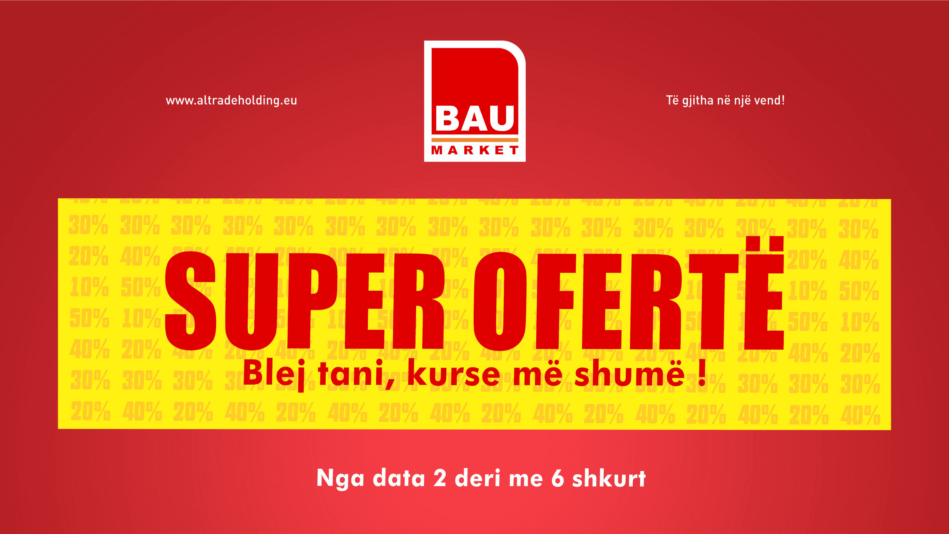 Bau Market ka përgatitur një super ofertë për fillimin e muajit shkurt.Produkte të reja, produkte gratis, e produkte të tjera në zbritje deri në 40%, ju presin gjatë kësaj kampanje që zgjatë nga 2 deri më 6 shkurt, e që i jep formë sloganit të përdorur deri tani #baukursimtar.