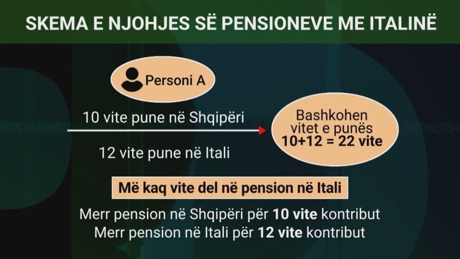 Marrim shembullin e një qytetari shqiptar që jeton në Itali. Personi A ka 10 vite pune në Shqipëri. D.m.th. ka derdhur kontribute për këtë periudhë. Më vonë, ai ka emigruar drejt Italisë, ku ka 12 vite pune të deklaruara, për të cilat ka paguar sigurime. Në çastin që marrëveshja bëhet aktive, bëhet i mundur bashkimi i viteve të punës dhe sipas përllogaritjeve, personit A i njihen 22 vite punë. Në Itali, mjaftojnë 20 vite punë për të dalë në pension. Kjo do të thotë se ky qytetar del automatikisht në pension dhe përfiton pension në Shqipëri, për 10 vitet që ka kontribuar dhe pension në Itali për 12 vitet e tjera.