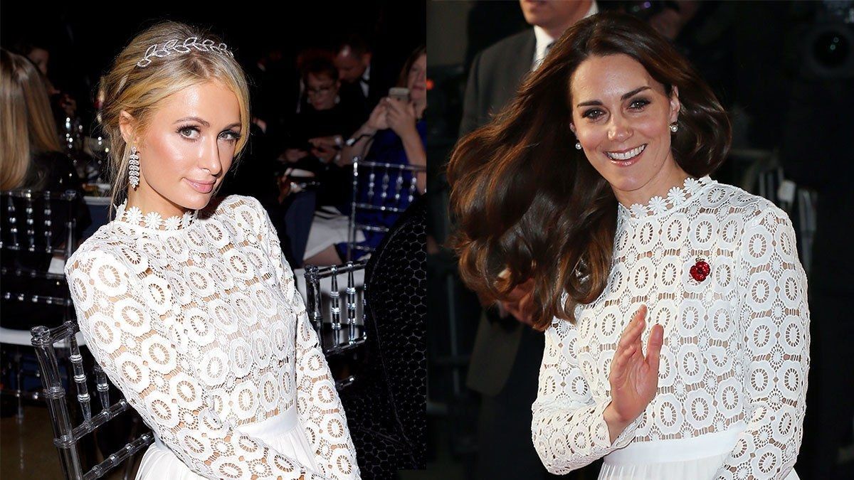 Derisa Kate Middleton stilin e ka përshtatur me këpucë me taka Gianvito Rossi dhe çantën Mulberi me ngjyrë të njëjtë, Paris Hilton dukjen e ka pasuruar me kurorë dhe vathë të varur.