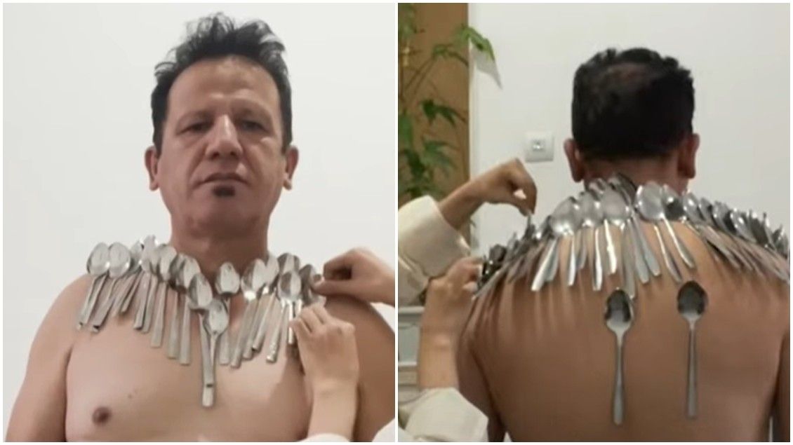 Një burrë iranian theu rekordin Guinness duke balancuar 88 lugë në vende të ndryshme në trupin e tij.