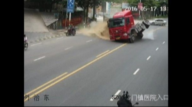 Një video shokuese ka filluar të qarkullojë në internet, ku shfaqet momenti kur një motoçiklist në Kinë i shpëton për një fije floku vdekjes, kur një kamion i ngarkuar me rërë rrotullohet vetëm disa centimetra larg tij.