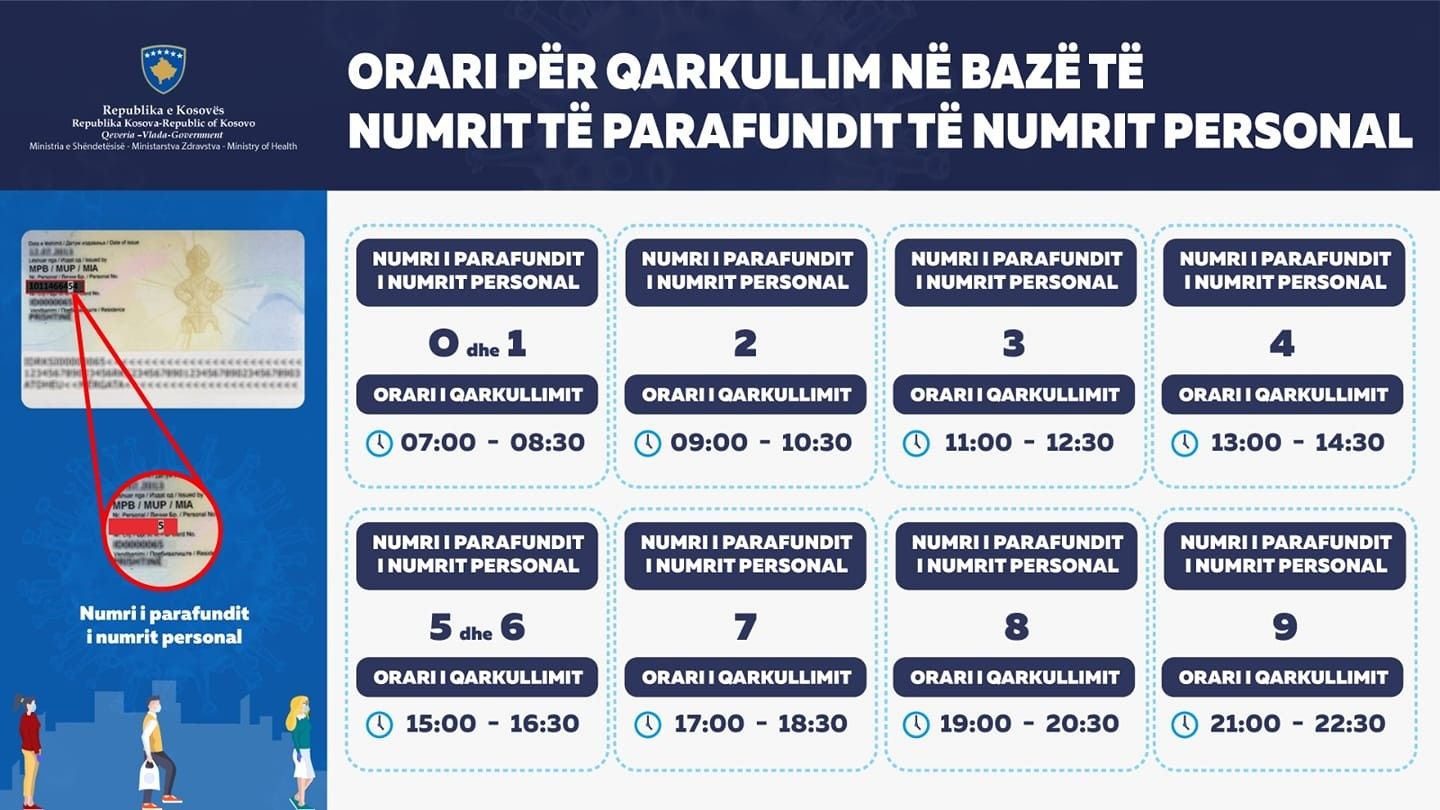 “Nga data 15 prill (e mërkure), ora 06.00, me qëllim të mbrojtjes së jetës së juaj, në tërë territorin e Republikës së Kosovës, hyjnë në fuqi masat rigoroze të lëvizjes me qëllim të pamundësimit të përhapjes së mëtejme të pandemisë Covid-19. Çdo qytetar, nga data 15 prill së paku deri më 3 maj, do të ketë të drejte të lëvizjes vetëm për 90 minuta gjatë orarit të përcaktuar në bazë të numrit të PARAFUNDIT të numrit PERSONAL”, thuhet në njoftimin e Ministrisë së Shëndetësisë, ku është bërë publik edhe shembulli përmes fotografisë se në bazë të cilit numër do të lejohet dalja jashtë.