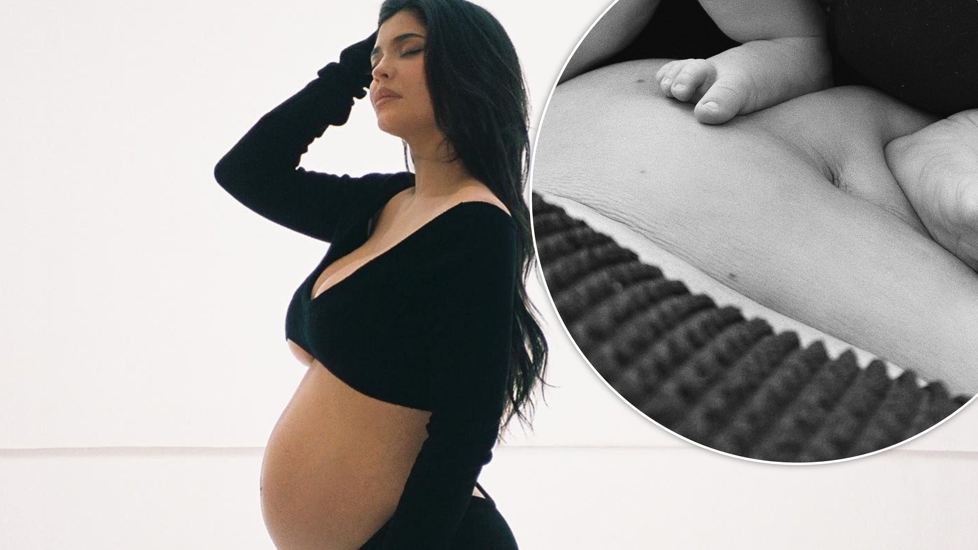 Fotoja bardh e zi zbuloi këmbët e zbathura të djalit të saj të porsalindur, teksa ajo e balanconte atë në stomakun e zbuluar.