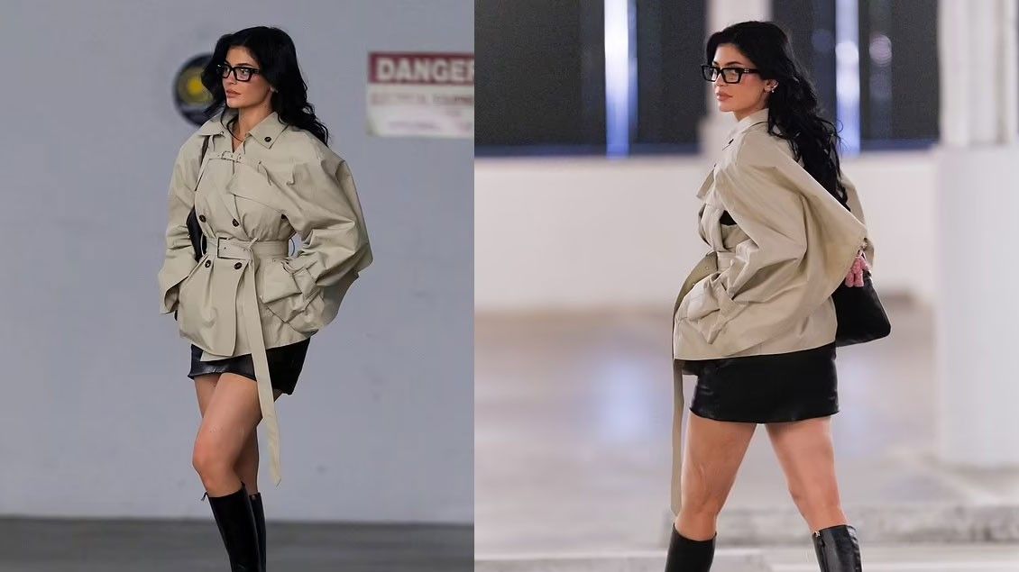 Themeluesja e “Kylie Cosmetics” u pa me një pallto të shkurtë bezhë ‘Miu Miu’, të kombinuar me një minifund lëkure të zezë dhe çizme deri tek gjuri.