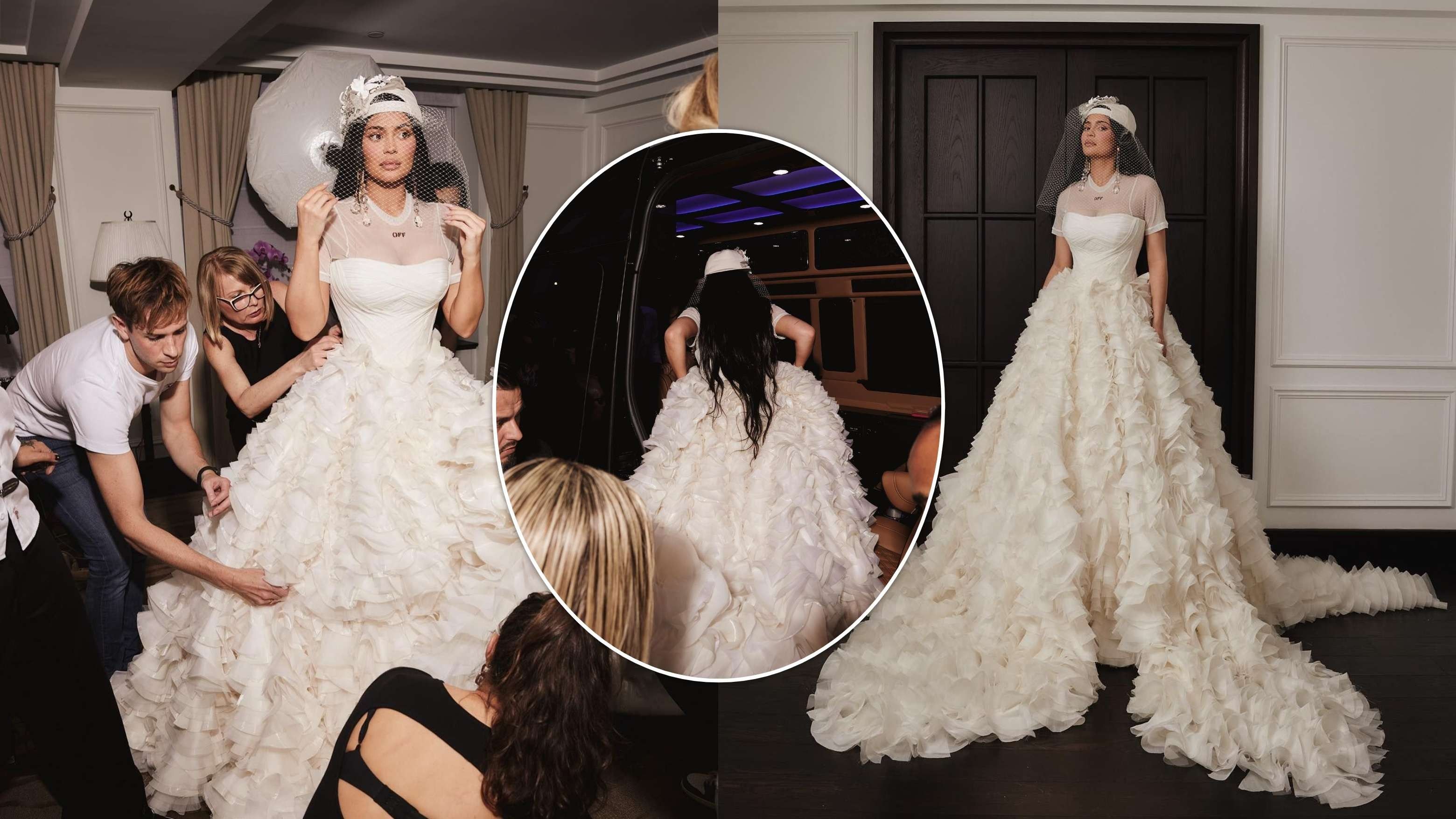 Fustani i yllit të realitetit 24-vjeçar përfshinte një fund dramatik dhe një bust të veshur sipër një bluze rrjetë me logon Off-White. Jenner ishte e pajisur me një vello të ngjitur në një kapelë bejsbolli mbrapsht.