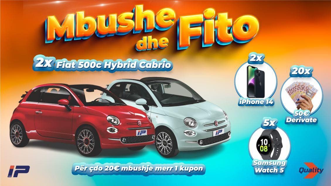 3.Fitoni shumë shpërblime: Sa më shumë kupona aq më shumë mundësi të fitoni njërin nga shpërblimet si: dy Fiat 500c Hybrid Cabrio, dy iPhone 14, pesë ora Samsung Watch 5 dhe 20 voucher me 50€ derivate.