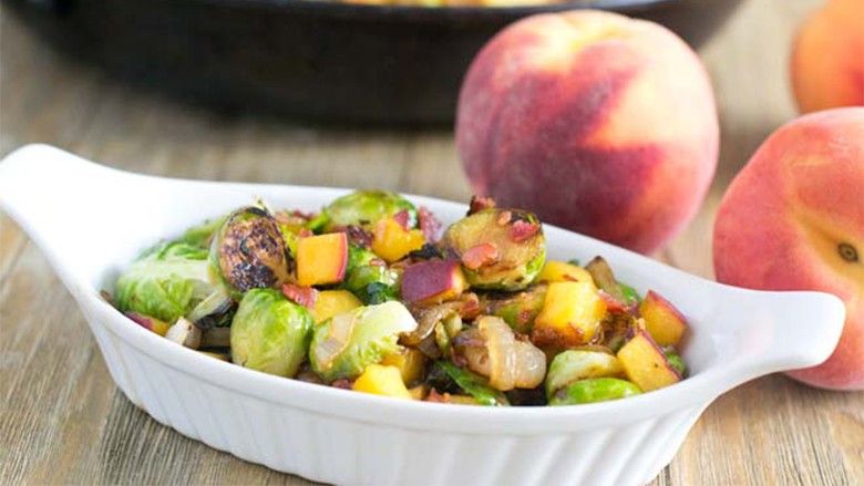 Përbërësit:▪ 6 feta proshutë ▪ 1 qepë (e prerë në feta) ▪ 450 gr lakra Brukseli (me maja të prera dhe të përgjysmuara) ▪ kripë ▪ piper i zi (i trashë) ▪ 2 pjeshkë (të copëtuara) ▪ 2 lugë gjelle shurup panje ▪ 1 lugë çaji lëng limoniPërgatitja: