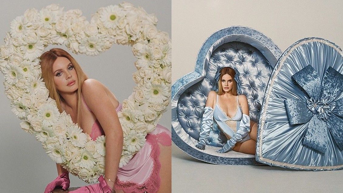 Lana veshi një kostum blu saten dhe dantella teksa pozoi në mënyrë joshëse brenda një zemre gjigante me duar të veshura me doreza dhe fjongo të ngjashme në flokë.