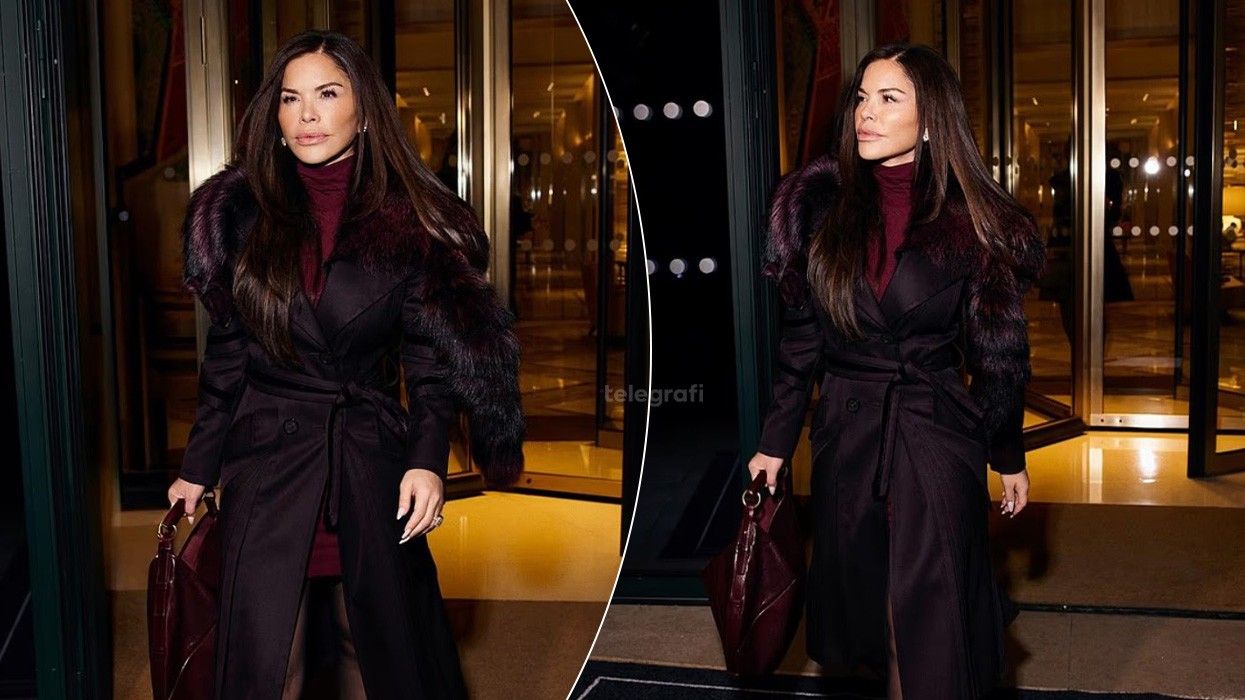 Lauren Sanchez, 56 vjeçe, u pa të premten duke dalë nga hoteli i saj në Paris e veshur elegante me fustan të kuqrremtë me jakë të rrumbullakët, geta transparente dhe taka të larta, të kombinuara me një pallto ngjyrë patëllxhani dhe shall leshi.